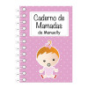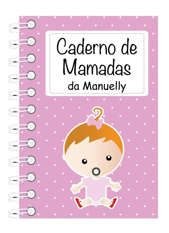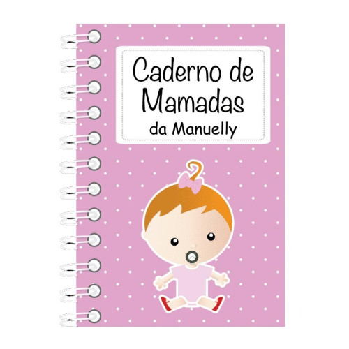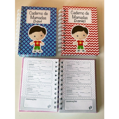 O caderno de mamadas é personalizado em capa dura, encadernação com wireo branco e fechamento com elástico.