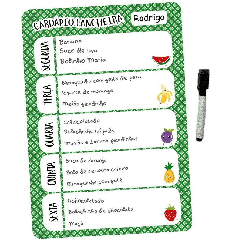 Para limpar o Cardápio Lancheira deve-se usar um paninho embebido em removedor comum ou saponáceo de cozinha, pois a tinta da caneta pode ficar marcada no produto ao escrever/apagar com a caneta-apagador;