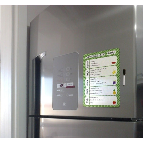 Cada espaço para escrever possui a medida de aproximadamente 12,5 cm x 4 cm; Já vem com imãs no verso para fixação na geladeira ou superfícies em metal;