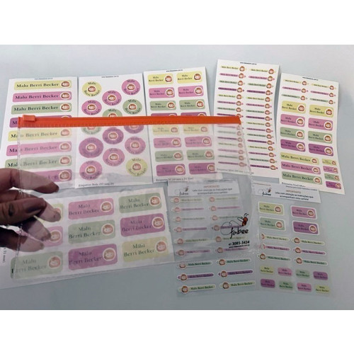 - 2 cartelas de etiquetas termocolantes para roupas e uniformes (total com 36 etiquetas)