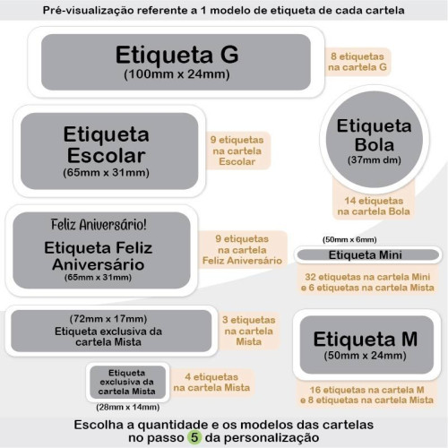 • Em cada kit de etiquetas, os personagens, kit moldura e nome se repetirão em todas as cartelas escolhidas;