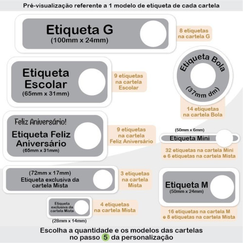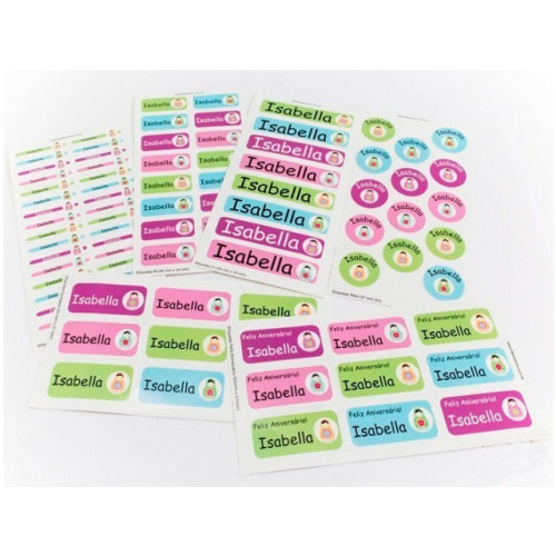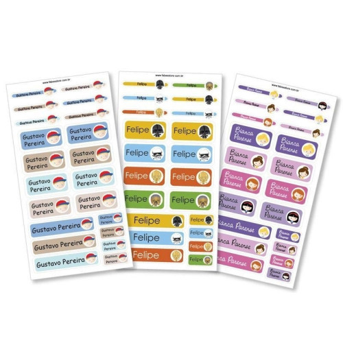 Em cada kit de etiquetas, os personagens, kit moldura e nome se repetirão em todas as cartelas escolhidas, de forma aleatória.