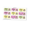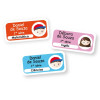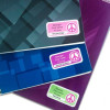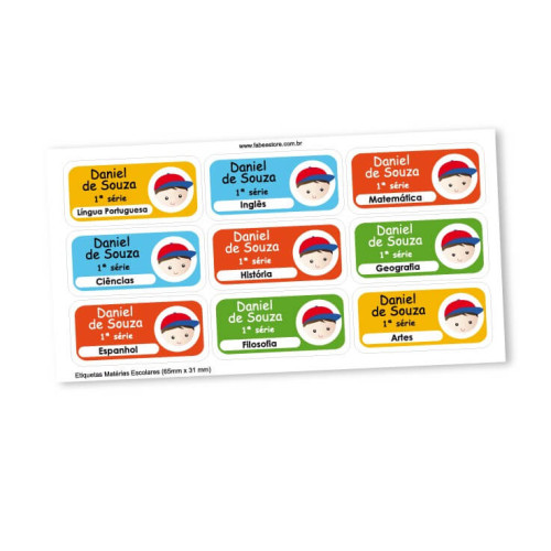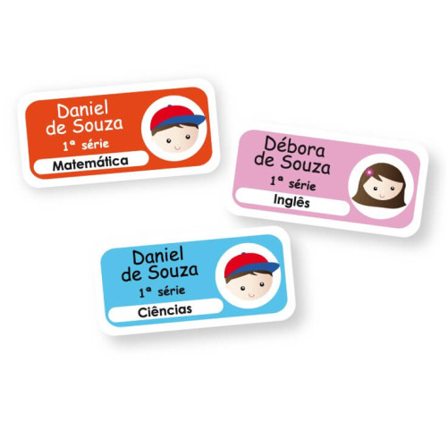 As etiquetas para matérias escolares têm 03 linhas das quais podem ser impressas o nome do estudante, turma, ano, série, classe ou nome da escola. Sendo que a quarta linha, em destaque, é destinada para identificar a matéria escolar em cada caderno (matemática, português, inglês, etc.).