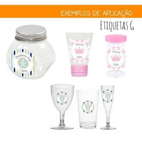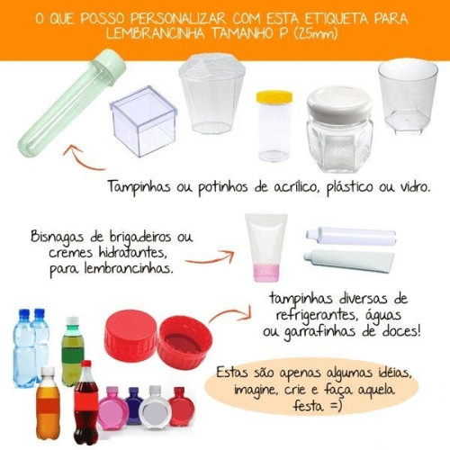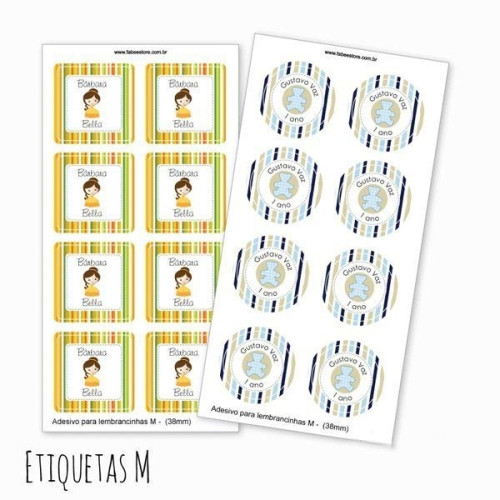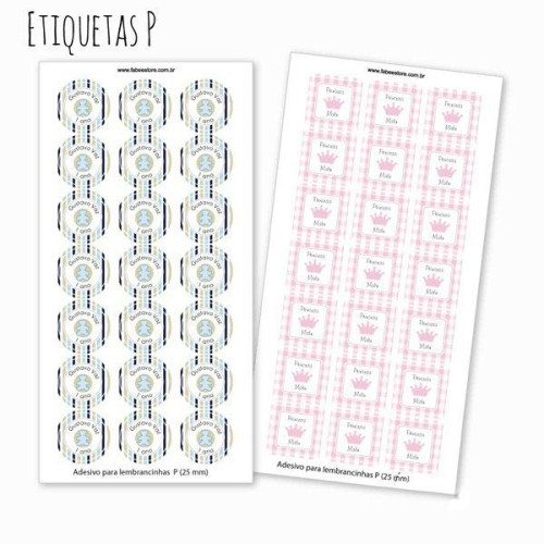 • Escolha os tamanhos das etiquetas para festa e seus formatos, você pode escolher as redondas ou as quadradas;