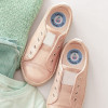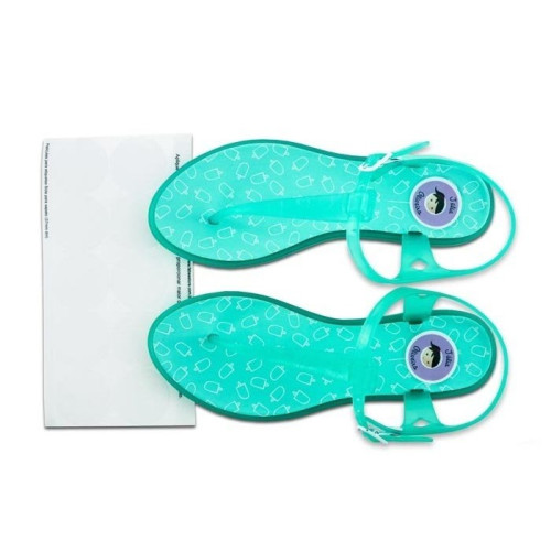 • Para sapatos de superfície não regulares como Crocs e Havaianas, a dica é colar a etiqueta colorida no solado, depois passe o ar quente do secador de cabelos por cima, cerca de 5 segundos, e depois cole a transparente em cima. Esse procedimento melhora a aderência da etiqueta;