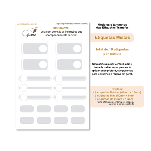 • Para as etiquetas transfer, são utilizados apenas o rostinho dos personagens da Turma da Fabee. Não colocamos o corpo inteiro devido ao tamanho das etiquetas (em especial a mini);
