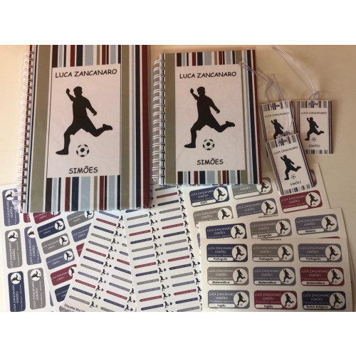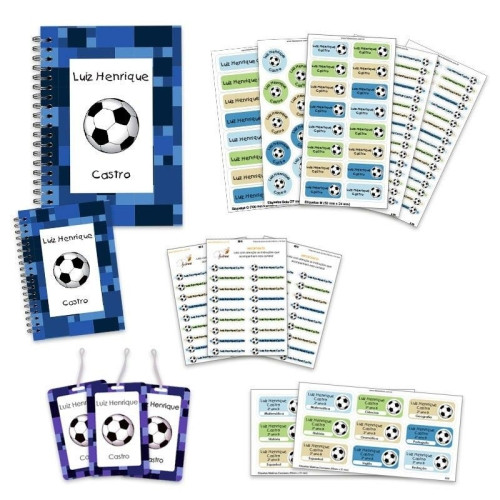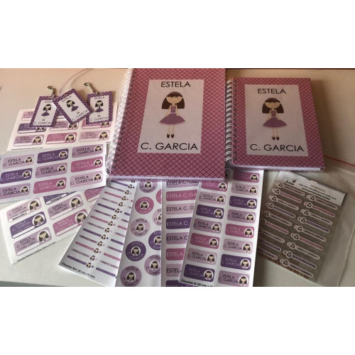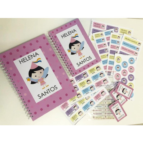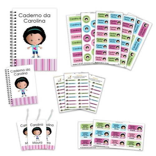 O kit volta às aulas personalizado (2) contém: 05 cartelas de etiquetas vinil impermeáveis para identificar material escolar em geral + 02 cartelas de etiquetas de vinil de matérias escolares para identificar os cadernos + 3 cartelas de etiquetas transfer termocolantes para identificar o uniforme + 3 tags mochila + 1 caderno P + 1 caderno G.