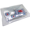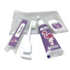 O Kit Higiene Dental Personalizado contém 1 escova de dente portátil com tampa, 1 pasta dental e 1 fio dental.