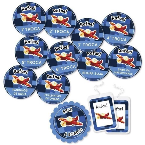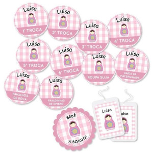 • 10 adesivos de: 1º TROCA, 2º TROCA, 3º TROCA, 4º TROCA, 5º TROCA, 6º TROCA, ROUPA SUJA, SAÍDA DA MATERNIDADE, PANINHOS DE BOCA e FRALDINHAS DE OMBRO;