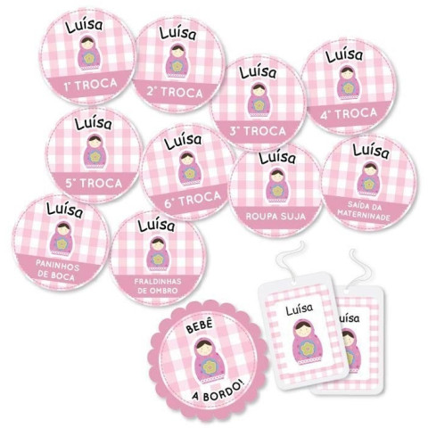 • Cartelas de vinil contendo: 10 adesivos de 8,1cm de diâmetro, o nome escolhido, personagem escolhido e as informações: 1º TROCA, 2º TROCA, 3º TROCA, 4º TROCA, 5º TROCA, 6º TROCA, ROUPA SUJA, SAÍDA DA MATERNIDADE, PANINHOS DE BOCA e FRALDINHAS DE OMBRO.