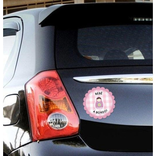 • 1 adesivo para carro de 10cm de diâmetro contendo o personagem escolhido e a frase BEBÊ A BORDO;