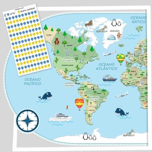 • Acompanha uma cartela com 70 adesivinhos para marcar os lugares onde já visitou e 70 adesivos para marcar onde gostaria de conhecer. =)
