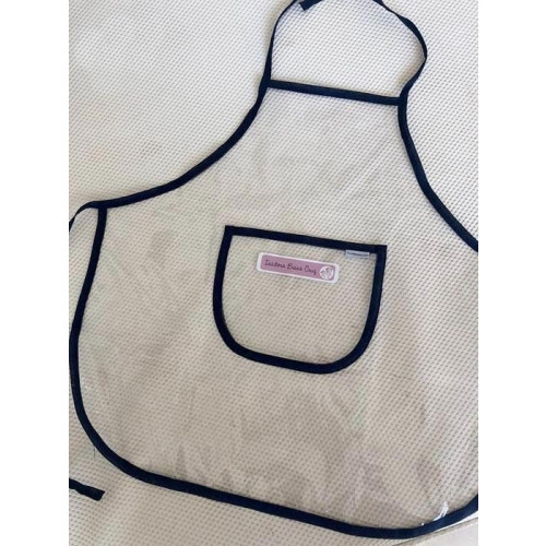 • Avental plástico com bolso frontal e acabamento das bordas em viés preto.