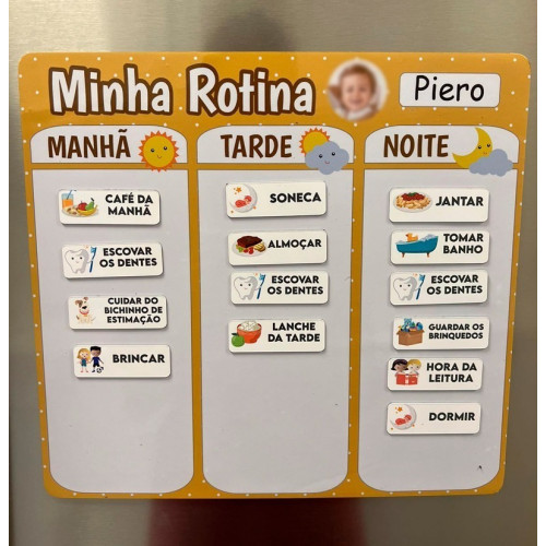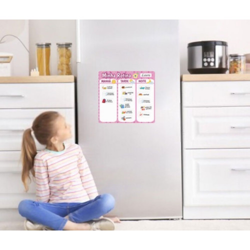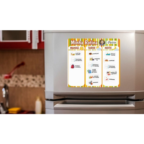 • Se a sua geladeira possuir a superfície para aplicação em alumínio, ou algum outro material que não seja metal, o imã não irá aderir. Por isso, recomendamos que peça a fixação por fita dupla face. Na dúvida se a sua geladeira aceita ou não imã basta aplicar um imã qualquer. Se grudar, o quadro de rotina também grudará sem problemas, se não, realmente é necessário pedir a fixação por fita dupla face ou procurar uma outra superfície metálica para testar, ok?