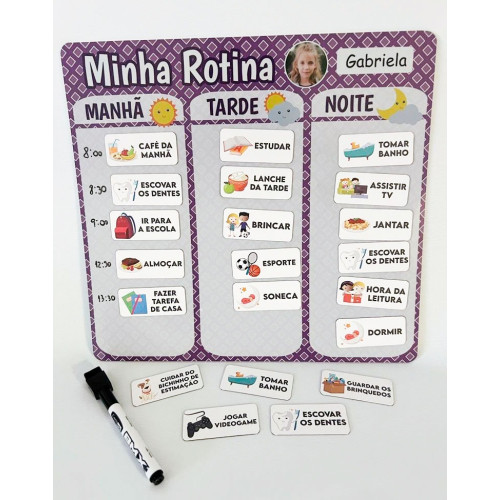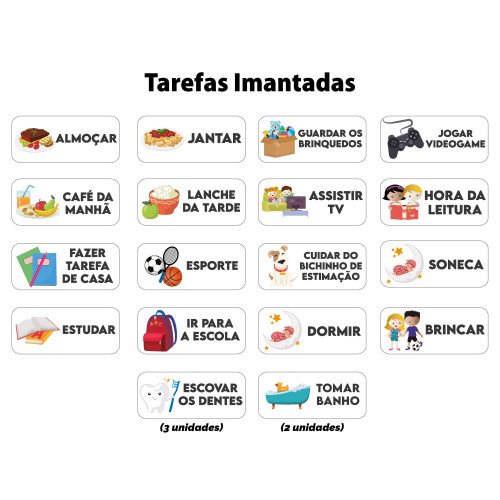 As tarefas extras que desejar deverão ser escritas com a canetinha que acompanha o produto diretamente no quadro, não é possível fazer imãs com outras tarefas além das descritas acima.